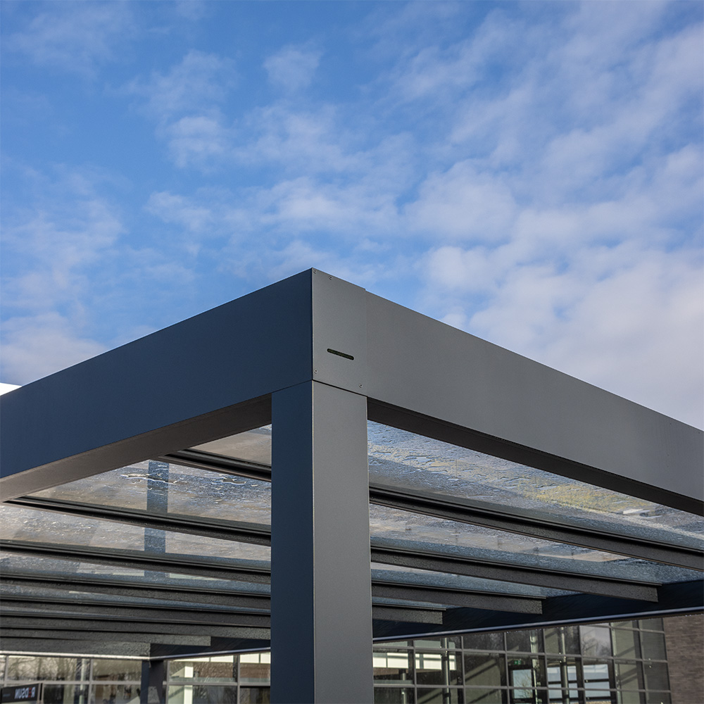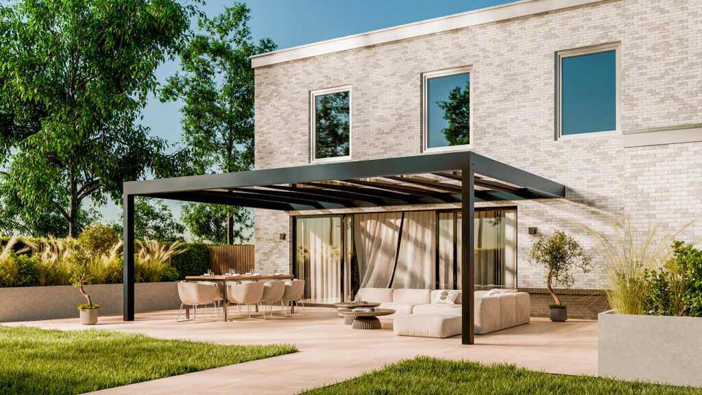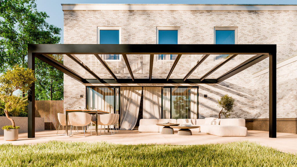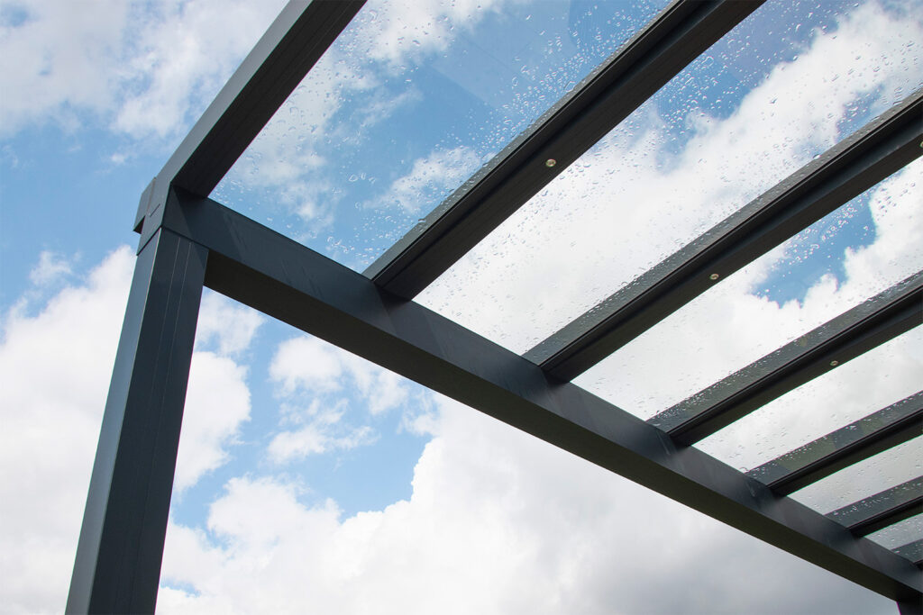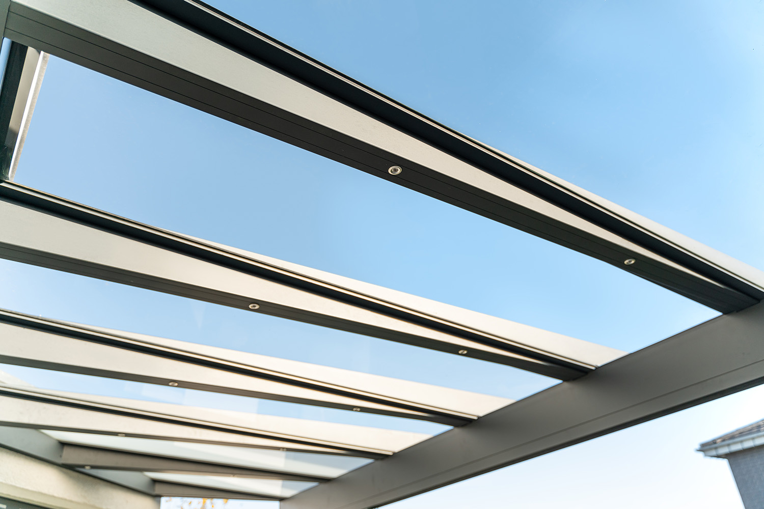 Je nach Modell und Statik sind bis 7000×5000 mm möglich (Ultraline auf 2 Pfosten, Skyline auf 4 Pfosten). Die exakte Auslegung hängt von Wind-/Schneelast ab.