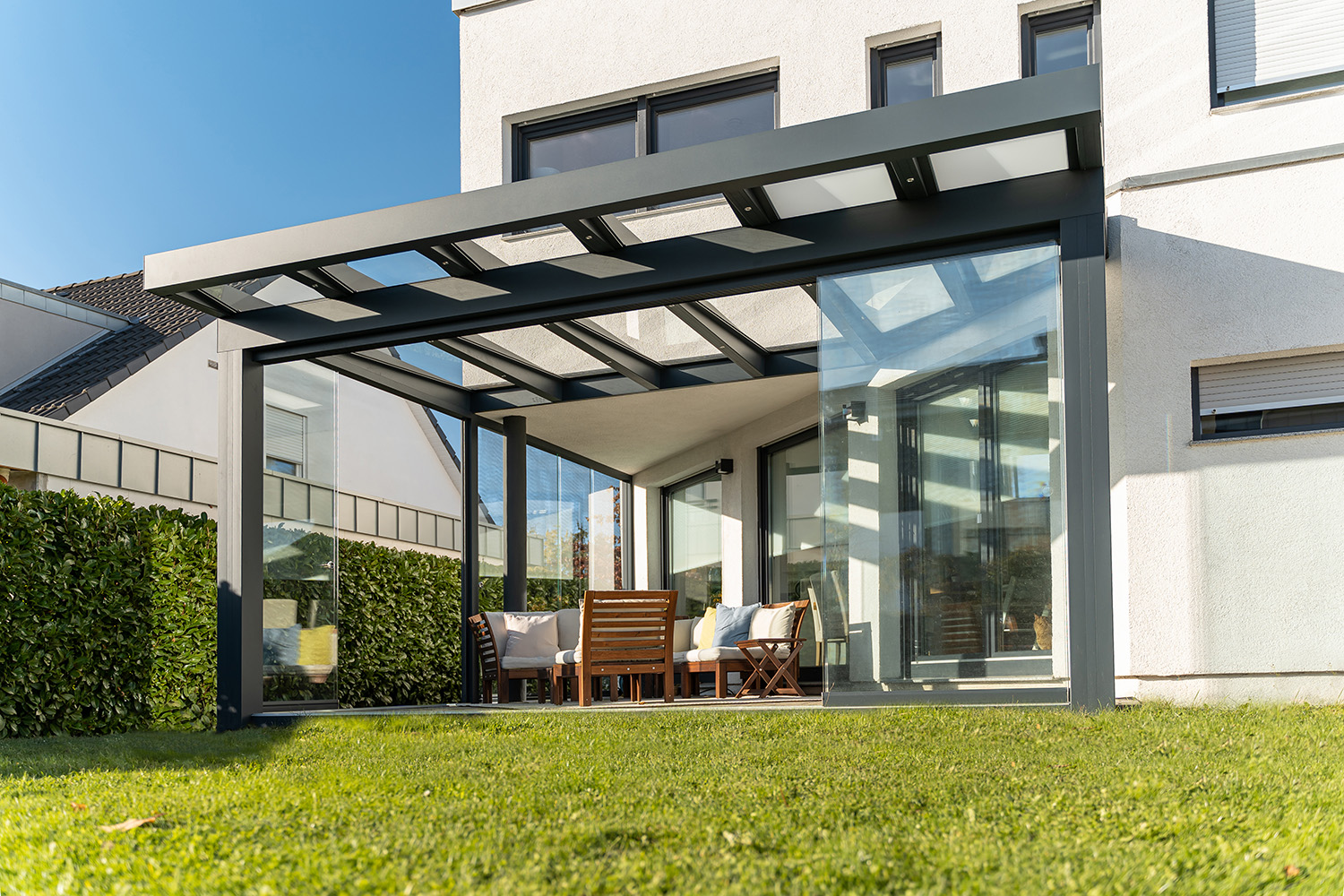 Alle Ultraline-Varianten werden als Maßanfertigung umgesetzt. Du wählst Größe, Verglasung und Farbe – und ergänzt bei Bedarf Markisen, LED-Licht oder Seitenelemente. Das macht Ultraline flexibel für Neubau, Anbau und die Aufwertung von Bestandsgebäuden.